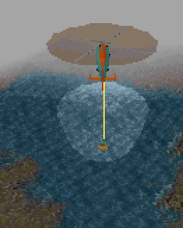 The water bucket (also called a "Bambi Bucket") can be filled or dumped only when lowered to some degree. When fully lowered, it is about fifty feet below you. It shares its water with your water cannon.